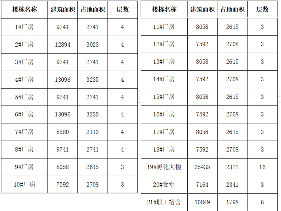 1#、2#、3#、4#、5#、6#、7#、8#廠房為4層丙類廠房:長87.3m、寬37m,每層面積約3000㎡;首層層高6.0米,二至四層層高為5.1米;9#、10#、17#、18#廠房為3層丁類廠房,長73m、寬36m,每層面積約2600㎡,首層層高9.0米,二層層高7.8米,三層層高6.6米;11#、12#、13#、14#、15#、16#廠房為3層丁類廠房,長73m,寬36m,每層面積約2600㎡,首層層高9.0米,二、三層層高6.6米;19#為16層框架剪力墻結構孵化大樓,建筑面積35435平方米;20#為3層框架結構食堂,建筑面積7164平方米,;21#、22#為兩棟6層框架結構宿舍,建筑面積21698平方米;25#、26#為門衛室2棟,建筑面積共計144平方米;27#為消防水池和泵房,建筑面積336.3平方米